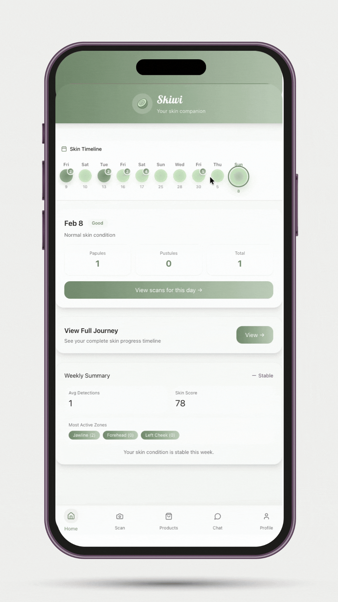 We know how it feels to have acne (really). Sitting alone in your bedroom, endlessly poking your face and googling what to do. Dermatologists take weeks to reach. With Skiwi, you’re never alone